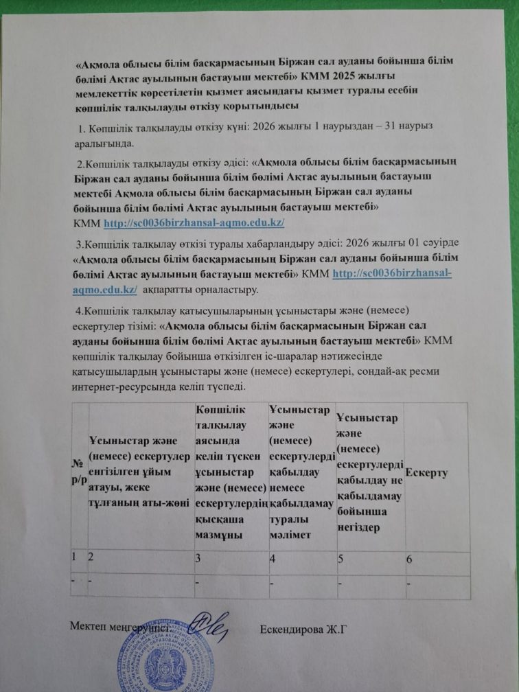 «Ақмола облысы білім басқармасының Біржан сал ауданы бойынша білім бөлімі Ақтас ауылының бастауыш мектебі» КММ 2025 жылғы мемлекеттік көрсетілетін қызмет аясындағы қызмет туралы есебін көпшілік талқылауды өткізу қорытындысы